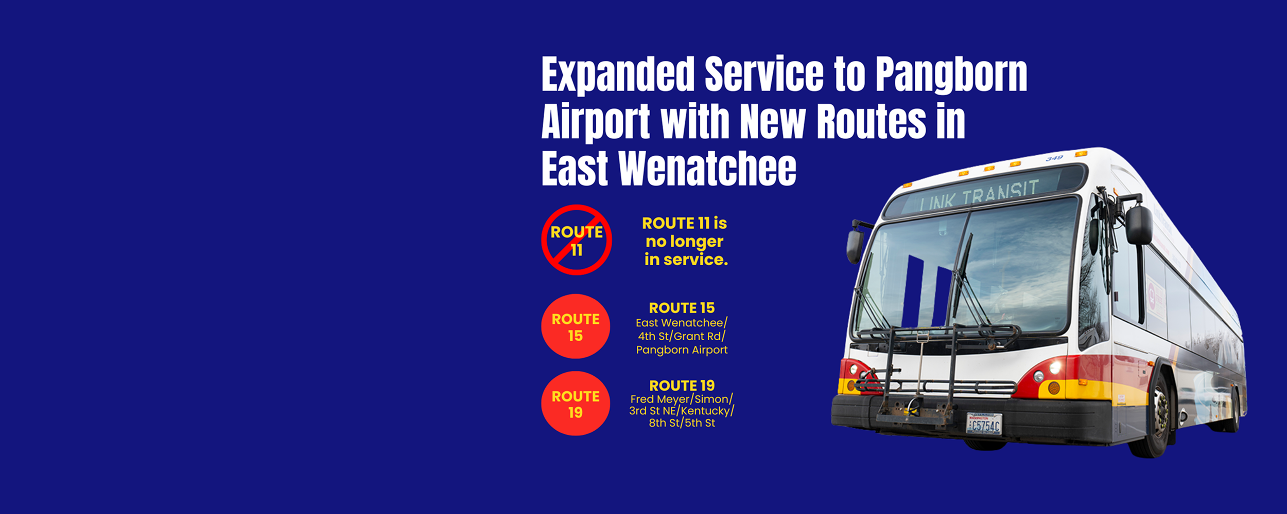 Beginning Monday, October 6, Link Transit will launch two new routes in East Wenatchee, expanding service along Grant Road and providing direct connections to residential areas and Pangborn Memorial Airport. As part of these changes, Route 11 will be discontinued, with coverage now provided by Route 15 and Route 19.