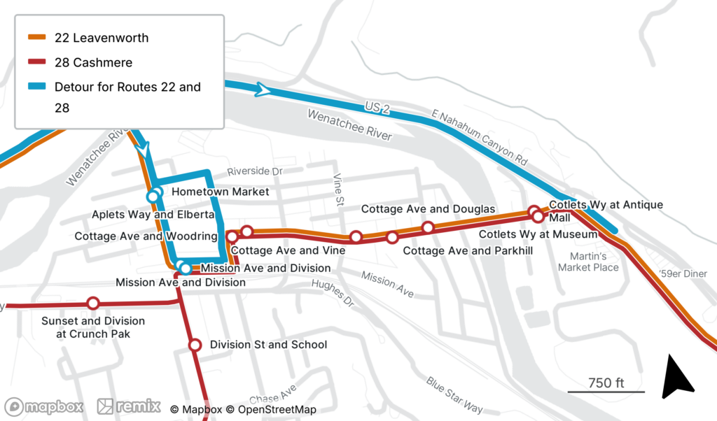 Effective 4/6/2026, Routes 22 & 28 will travel the detour below due to a closure on Cottage Ave for sewer maintenance.